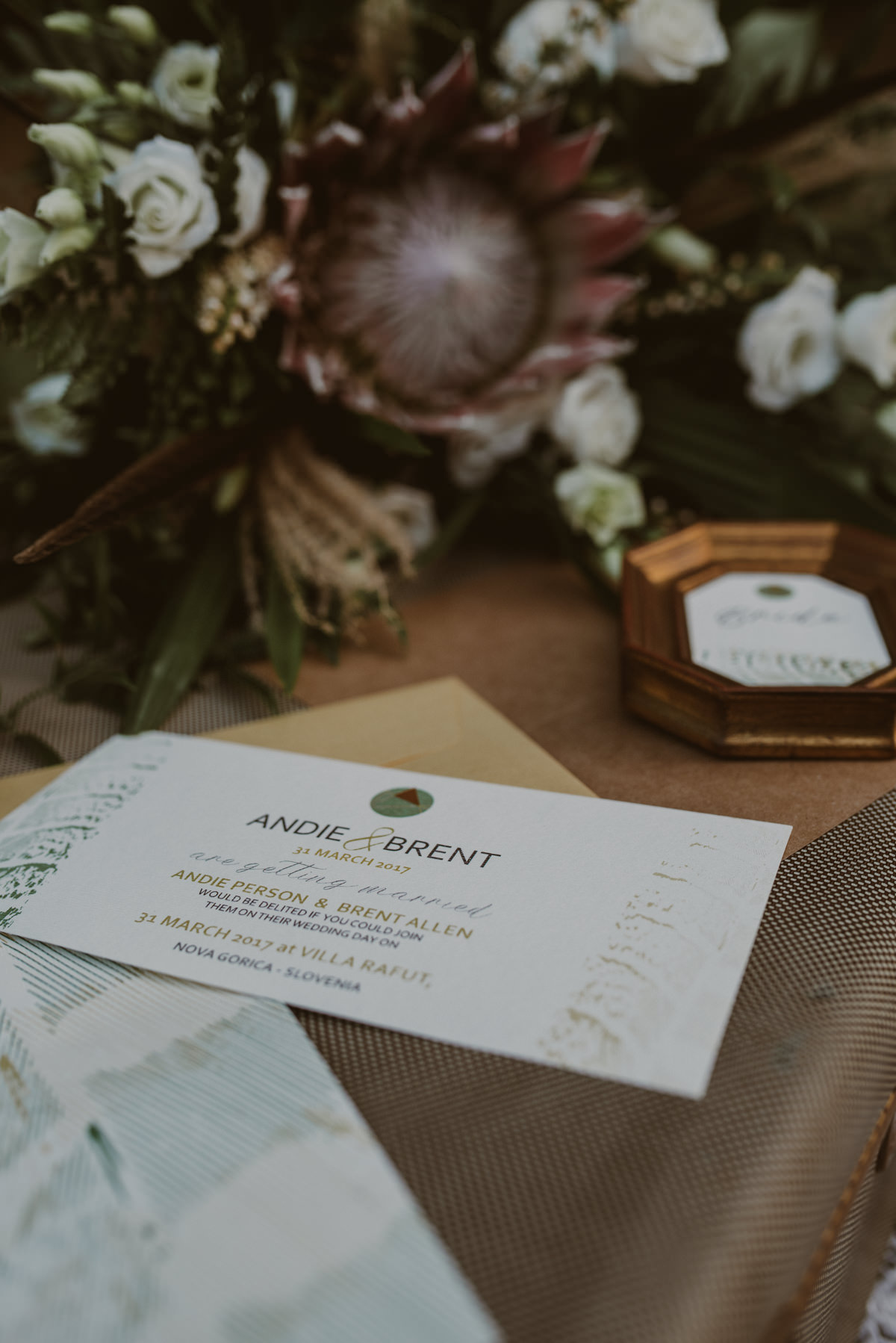 Jasna from Pravljicni trenutek wedding organisation did not hesitate for a moment when I invited her to help me organise the wedding. Together with florist Andreja from AJ Decor and designer Marjen Jug we talked through and decided to keep things natural and organic with a touch of gold. When this girls came out with the ideas I was sure it is going to be magic. And so It was. As a result of their ideas were geometrical shapes in the details found on this amazing architecture.